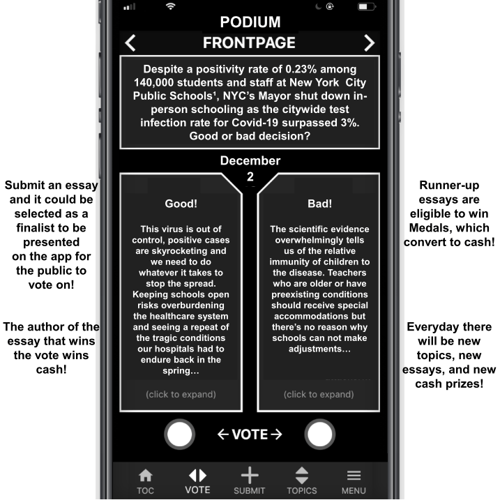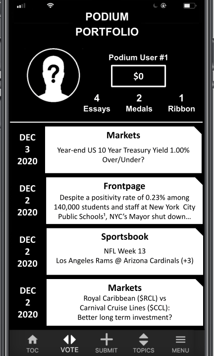 Users submit analysis of sports games. For example, if the Knicks were scheduled to play the Lakers. Users will submit essays explaining why the Knicks are going to win and other users will submit essays explaining why the Lakers are going to win. The best essay in favor of the Knicks and the best essay in favor of the Lakers will be curated by Podium’s human employees. Users will vote on which essay they think is better, and the author of the winning essay will get paid a cash prize before the game even starts. Users can log on to Podium and consume high quality qualitative betting analysis for free.